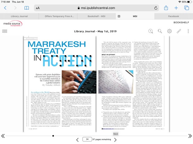 Library Journal “Marrakesh Treaty in Action” (May 2019)